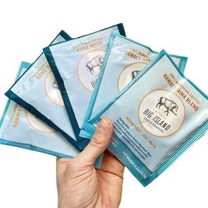 Our Single Serve Kona coffees are sourced from family farms around the Hawaii Islands, then milled in small batches, roasted, ground, and packaged in fully-compostable packets.