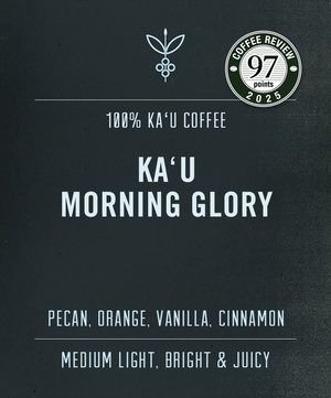 Discover a favorite coffee among locals: Kaʻū Morning Glory — a top-rated Big Island coffee with an extraordinary 97 points on Coffee Review, making it our highest-scoring coffee to date, and the highest scoring Kaʻū coffee ever.