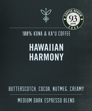 As an espresso, Hawaiian Harmony presents a silky crema, low acidity, and a balance between medium and medium-dark roast flavor profiles. While we originally created this 100% Hawaiian blend for espresso, it's become a popular choice for everyday drinking via filter, pour over and press pot, offering delightful notes of butterscotch, cocoa, nutmeg, and dried fruit, with a hint of whisky.