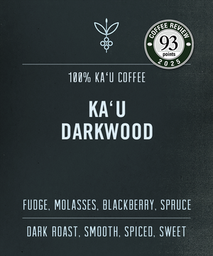 Kaʻū Darkwood is a bold, full-bodied dark roast crafted from 100% Kaʻū coffee — the same origin and beans as our celebrated Kaʻū Morning Glory, but roasted deeper to unlock a different range of flavors. With rich notes of fudge, molasses, blackberry, vanilla, and spruce, this coffee delivers a silky, layered experience that satisfies both black coffee purists and those who enjoy milk-based drinks.