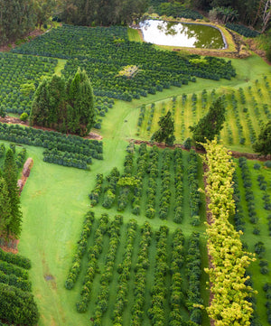Our journey with this coffee is a continuation of a trusted farm partnership since 2019, and the relationship that has previously brought you gems like 95pt Kaʻū Cloud Maragogipe. The producer, Miles, farms 12 acres and a half dozen coffee varieties in the misty hills of Wood Valley. He forgoes the use of Roundup, pruning a 'skirt' in the trees instead to shade out competing grass.